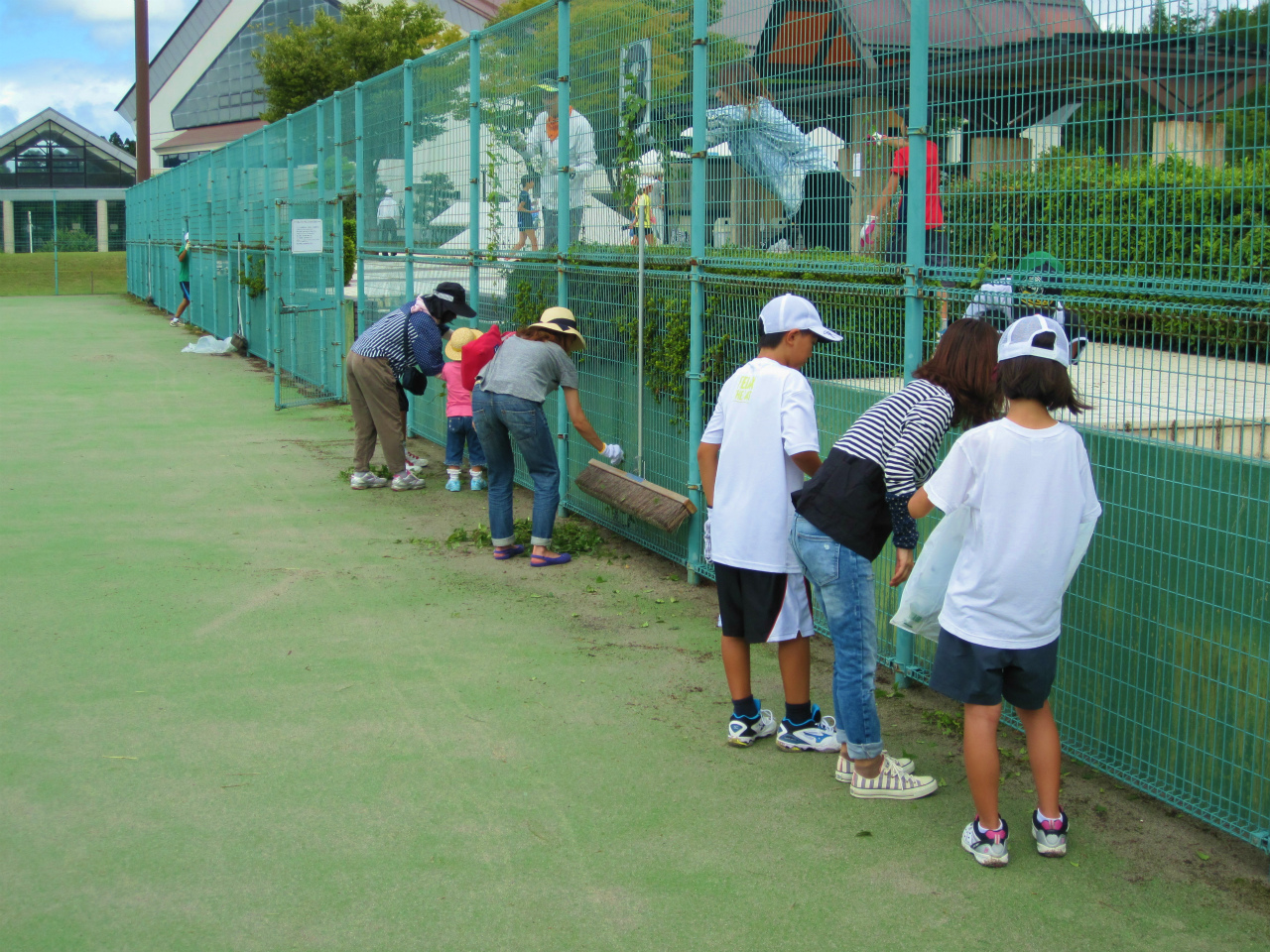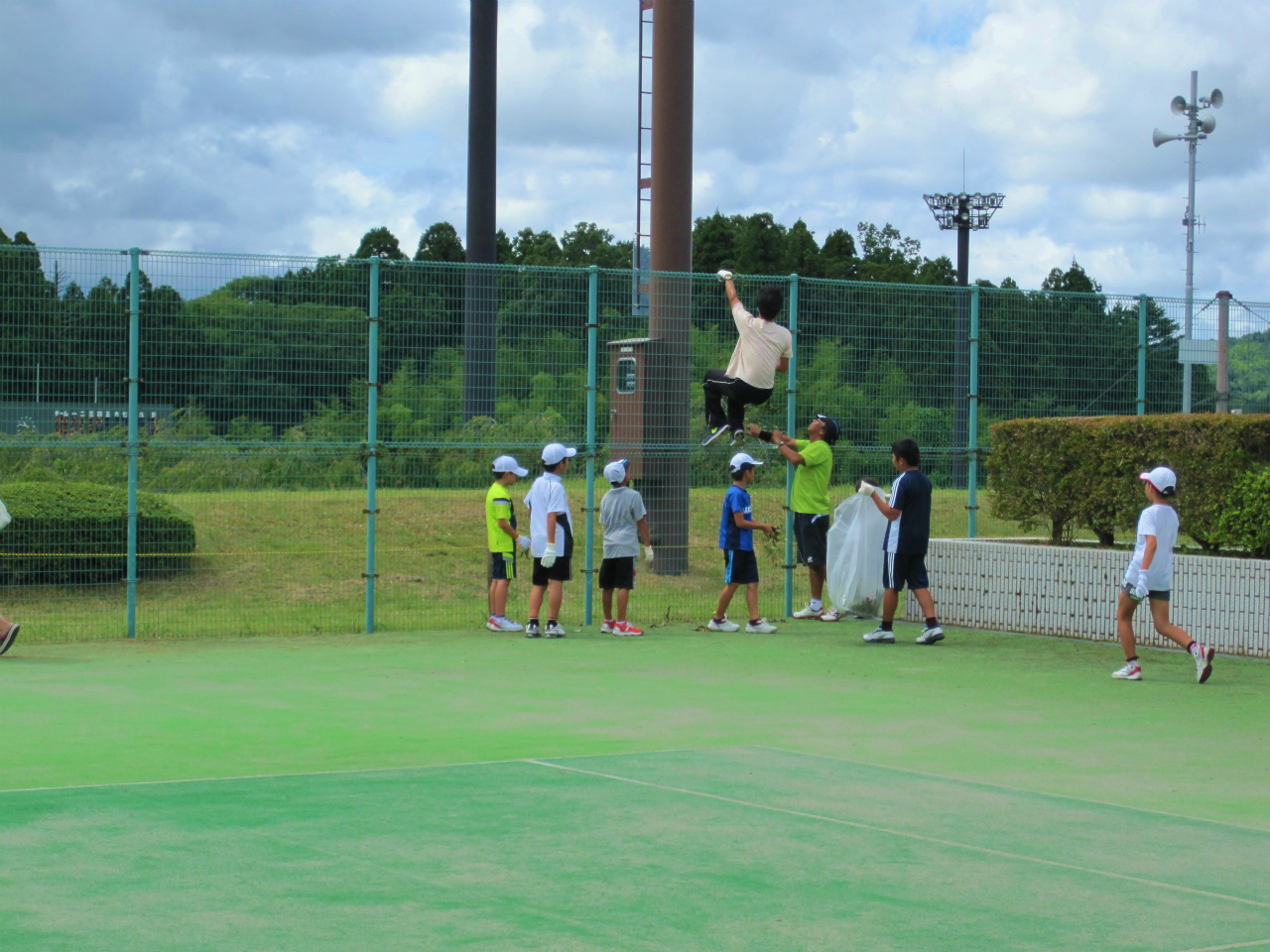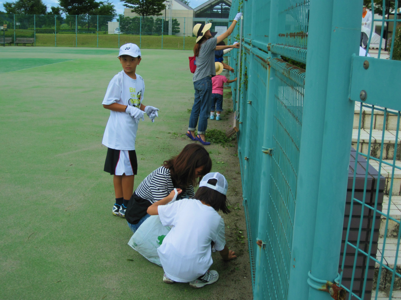 綺麗なコートでお迎えできるように、ジュニアの生徒達と草刈りをしました。